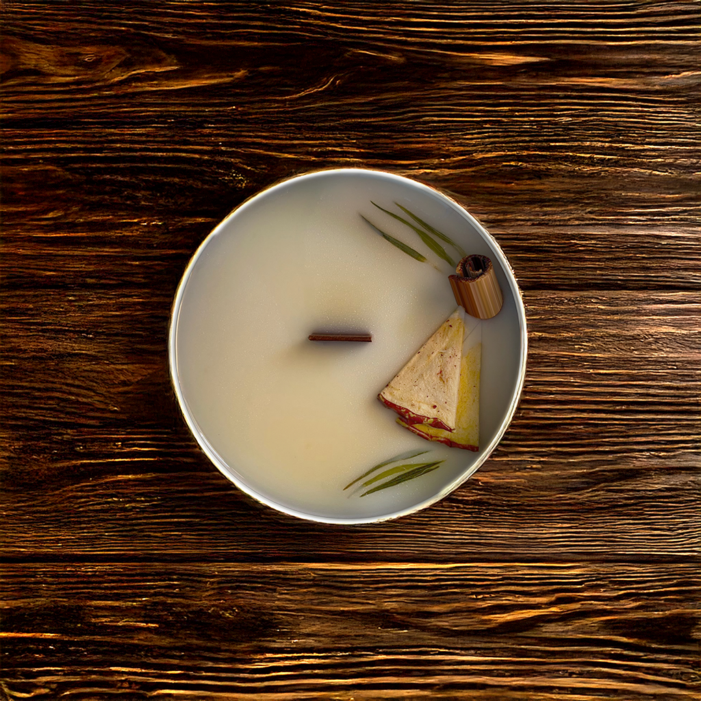 Créez une ambiance chaleureuse avec cette bougie en cire de soja parfumée à la pomme et à la cannelle, idéale pour les soirées d’hiver. -