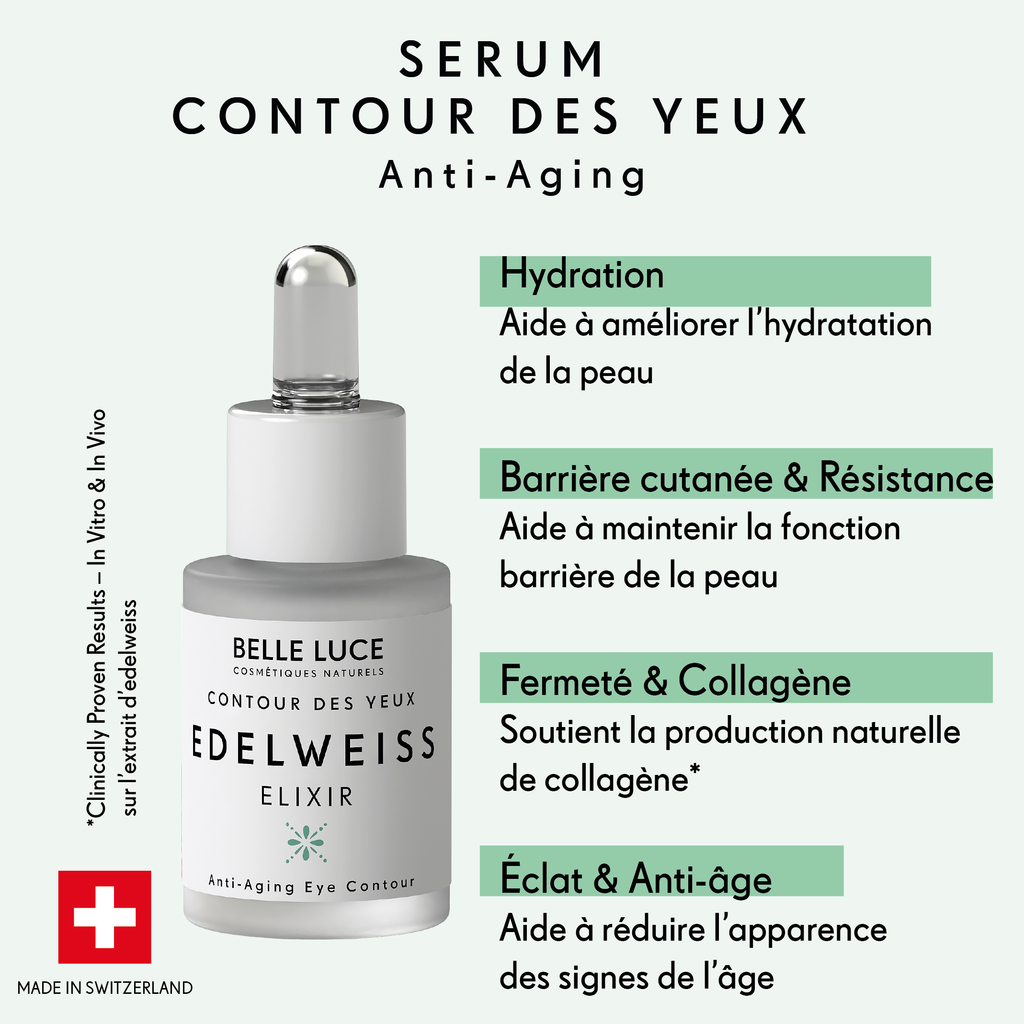 Le Soin Contour des Yeux Anti-Âge Élixir Edelweiss est une formule naturelle, conçue pour respecter l’équilibre de la peau. Elle associe les propriétés protectrices et antioxydantes de l’Edelweiss à un complexe biotechnologique d’origine naturelle breveté.